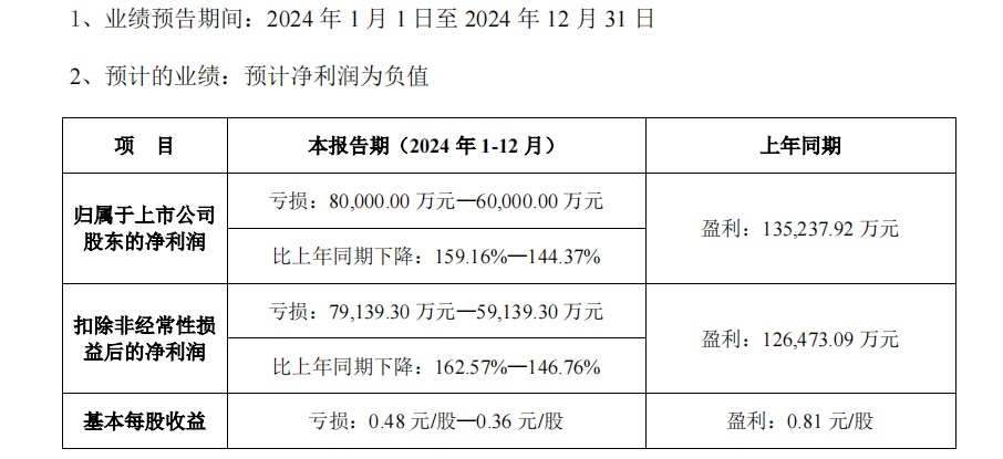 以岭药业股份2024年度预计归母净利润为亏损8亿元至6亿元,较上年的盈利13.52亿元大幅下降159.16%至144.37%;扣非净利润亏损7.91亿元至5.91亿元,同比下降162.57%至146.76%。基本每股收益预计亏损0.48元/股至0.36元/股,上年为盈利0.81元/股。