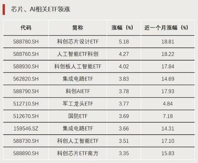 人工智能ETF科创(588760)、科创板人工智能ETF(588930)涨幅超过4%,还有多只集成电路ETF、国防ETF涨幅超过3%。