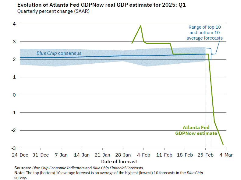 “投资者担心关税不仅将推高通胀,更有可能拖累经济增长,从而形成滞胀局面。亚特兰大联储GDPNow模型对一季度的GDP预测下调至-2.8%。而最新的2月制造业PMI小幅回落至50.3,低于预期,这对于致力于推动制造业回流的特朗普来说并不是好消息。”嘉盛集团资深分析师陈杰瑞(Jerry Chen)告诉记者,美国经济逐渐减速的现状还导致美债收益率和美元指数延续弱势,后者跌破107关口。