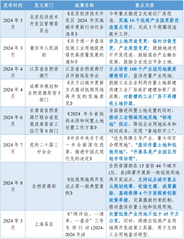 1)为盘活低效和存量资产,政策鼓励土地性质变更、新增面积、土地年延期等,对于资产持有方有更大动力进行改造;