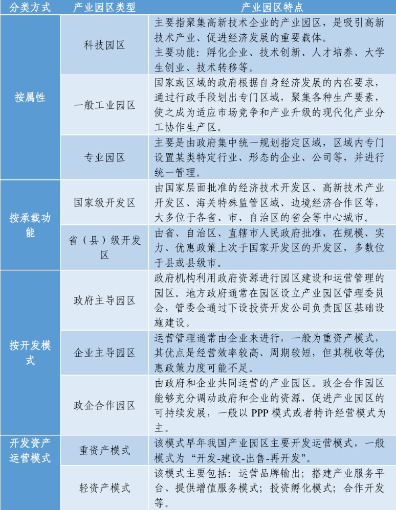 随着经济的不断发展,产业园区呈现多元化发展。目前我国的产业园可以按照属性、承载功能、开发模式和开发资产运营模式四种方法进行划分。