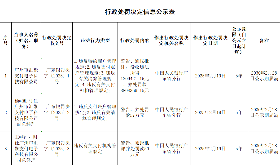2月28日,中国人民银行官网行政处罚公示披露,中国人民银行广东省分行于2025年2月19日对广州市汇聚支付电子科技有限公司(下称“汇聚支付”)开出罚没合计1062万元的行政处罚,成为年内央行分支机构对支付机构开出的第二张千万级罚单。此次处罚再次引发市场对支付行业合规性的高度关注。