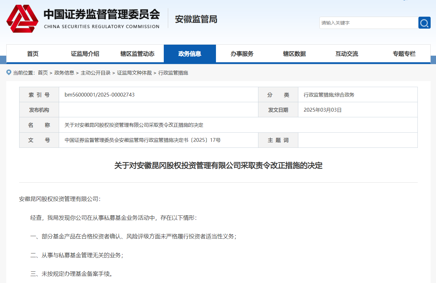 3月3日,安徽证监局发布行政监管公告,针对安徽昆冈股权投资管理有限公司(以下简称“昆冈股权公司”)在私募基金业务中存在的多项违规行为,依法采取监管措施,这是近期私募行业监管趋严背景下又一典型案例。
