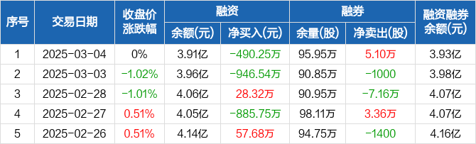 融资方面,当日融资买入1088.35万元,融资偿还1578.6万元,融资净偿还490.25万元。融券方面,融券卖出5.1万股,融券偿还0股,融券余量95.95万股,融券余额186.14万元。融资融券余额合计3.93亿元。