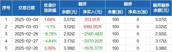 融资方面,当日融资买入6385.76万元,融资偿还5871.85万元,融资净买入513.91万元。融券方面,融券卖出0股,融券偿还0股,融券余量100股,融券余额5561元。融资融券余额合计3.07亿元。