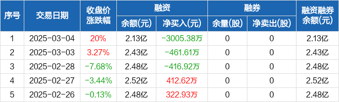 融资方面,当日融资买入4260.06万元,融资偿还7265.44万元,融资净偿还3005.38万元,净偿还额创12个月新高,连续3日净偿还累计3883.9万元。融券方面,融券卖出0股,融券偿还0股,融券余量0股,融券余额0元。融资融券余额合计2.13亿元。