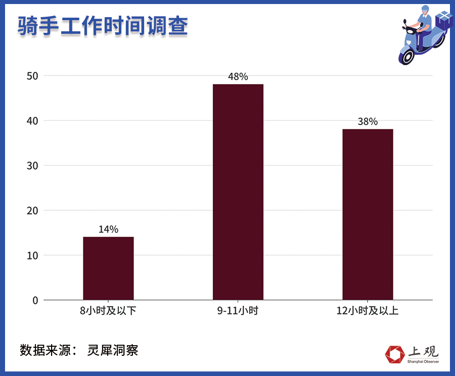 在灵犀洞察2023年对骑手的一项调查数据中,有48%的样本骑手每日工作时间在9到11小时之间,38%的样本骑手工作时间超过12小时。