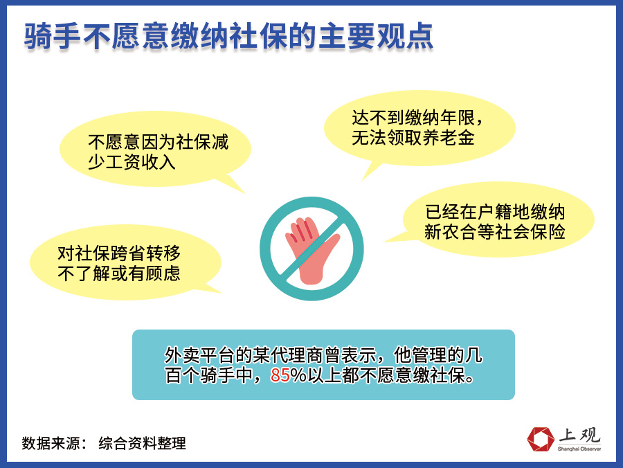 一些骑手对进入社保行列感到欣慰,但也有骑手表达了反对。原因是什么?上海普陀区万有引力新业态新就业群体党群服务中心曾开展了一次立法大讨论,会上一位饿了么骑手代理商表示,在他管理的几百个骑手中,不愿意交社保的原因,有这么几种: