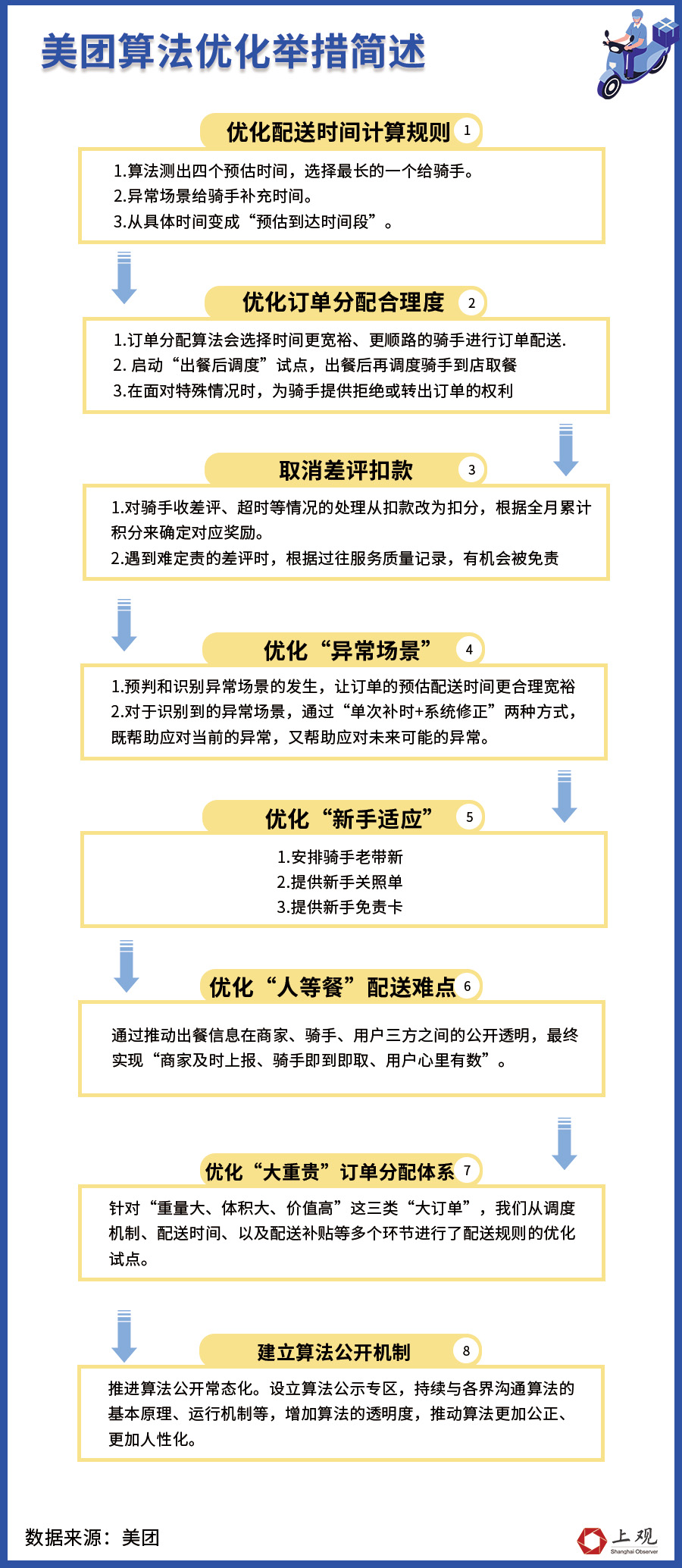 以美团为代表的外卖平台已经持续地在算法和机制上发力,为外卖员减轻工作压力,这股算法更新和算法透明的风,同样也吹到了平台"内卷"中,今年1月底,饿了么官方发布公告,推动平台规则透明化,在"算法透明"、"算法协商"、"机制更新"等层面提出了措施。