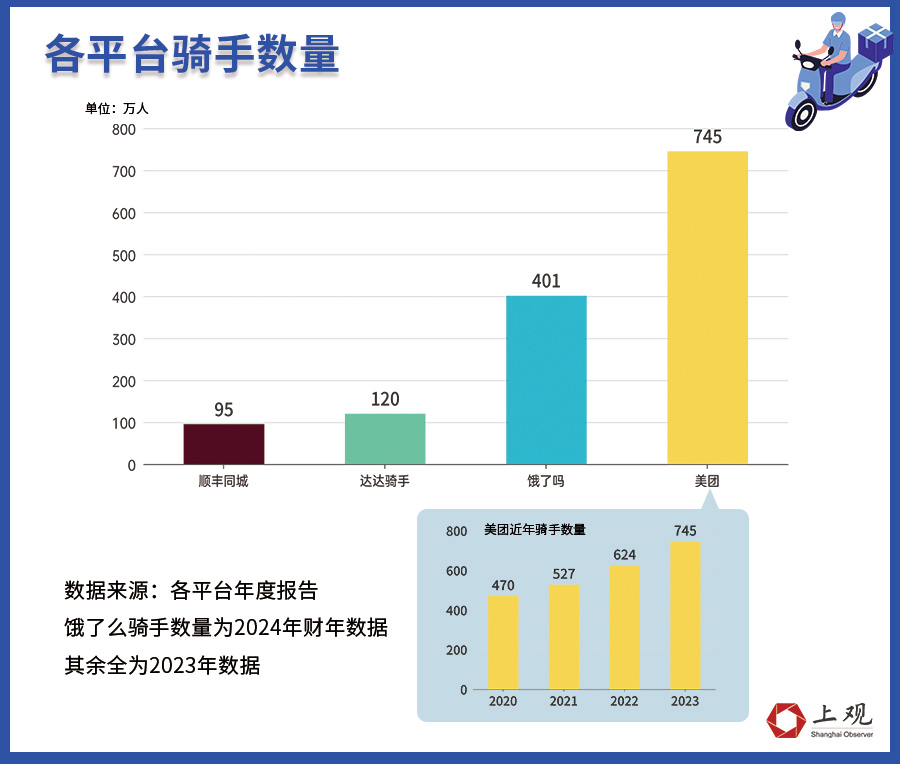根据以上平台公布的年度报告,2023年骑手数量(饿了么为2024财年)分别为745万、401万、120万、95万,合计1361万。其中,美团骑手数量最多,从2020年的470万迅速增长至2023年的745万。