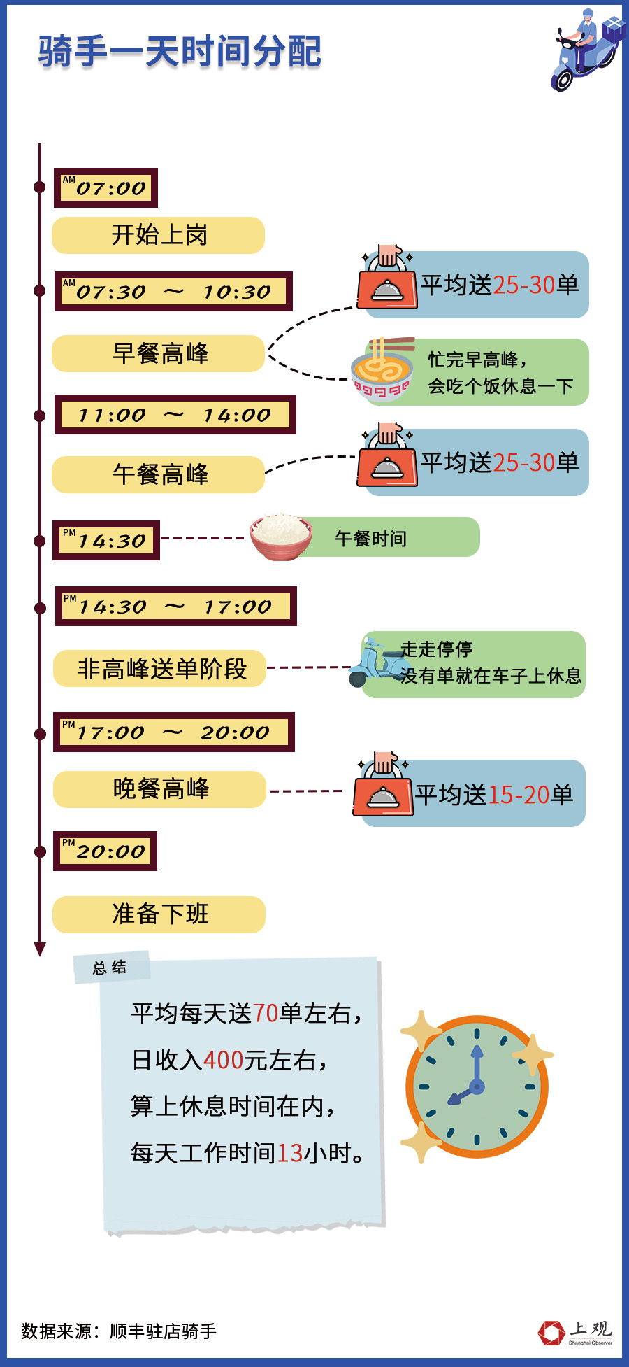 我们曾对上海的一名骑手做过一天的时间分配调查,从他开始早上7点钟开始上班到晚上8点钟下班,中间有13个小时的工作时间,但其中包括吃饭、休息、和非高峰时段的待机时间,真正有单时长远不到13小时。