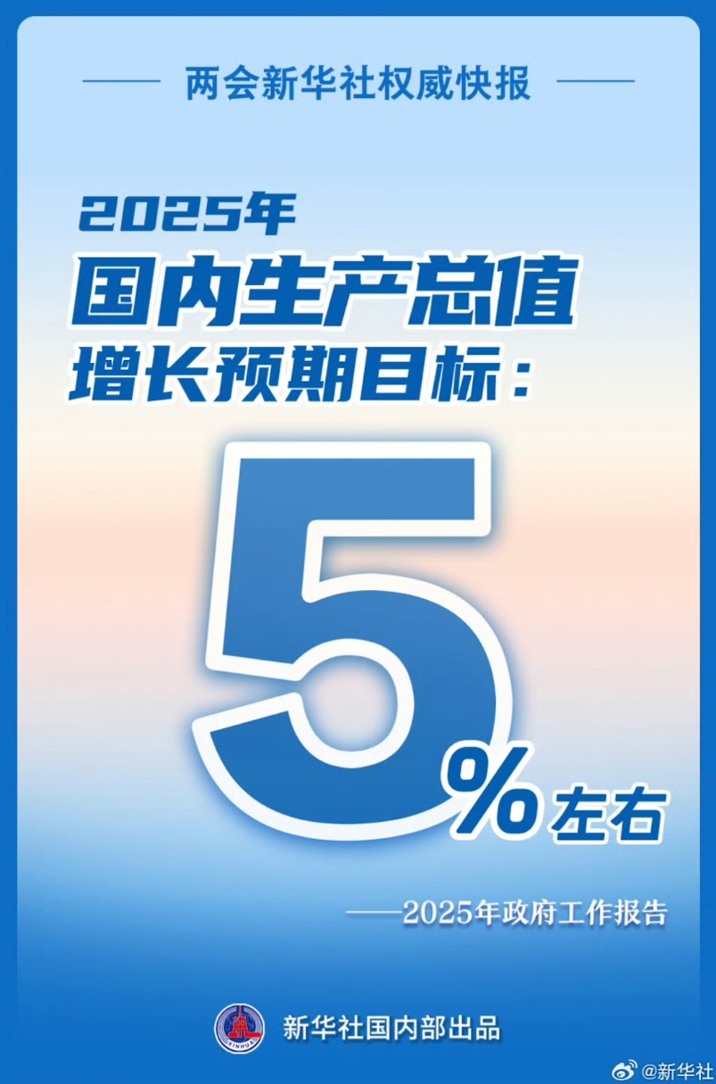 政府工作报告提出,今年发展主要预期目标是:国内生产总值增长5%左右。