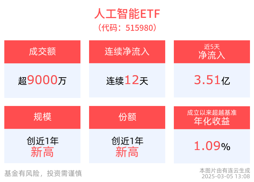 拉长时间看,截至2025年3月4日,人工智能ETF近1月累计上涨12.46%。规模方面,人工智能ETF最新规模达27.35亿元,创近1年新高。份额方面,人工智能ETF最新份额达25.08亿份,创近1年新高。