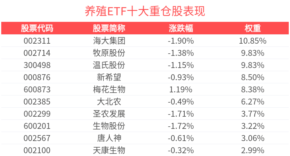 数据显示,截至2025年2月28日,中证畜牧养殖指数(930707)前十大权重股分别为海大集团(002311)、温氏股份(300498)、牧原股份(002714)、新希望(000876)、梅花生物(600873)、大北农(002385)、圣农发展(002299)、生物股份(600201)、唐人神(002567)、天康生物(002100),前十大权重股合计占比69.16%。