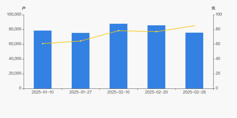 截至2025年2月28日,公司最新总股本为4.82亿股,其中流通股本为4.2亿股。户均持有流通股数量由上期的4898股上升至5542股,户均流通市值47.14万元。