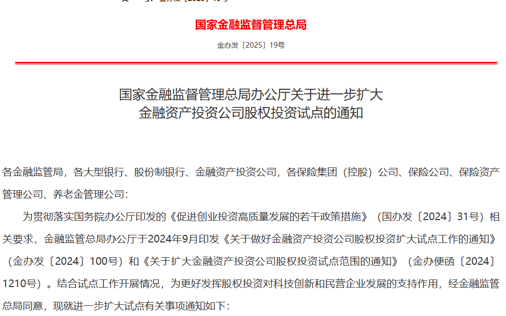 3月5日,为更好发挥股权投资对科技创新和民营企业发展的支持作用,金融监管总局发布《关于进一步扩大金融资产投资公司股权投资试点的通知》(金办发〔2025〕19号,下称“《通知》”),进一步优化完善试点政策。