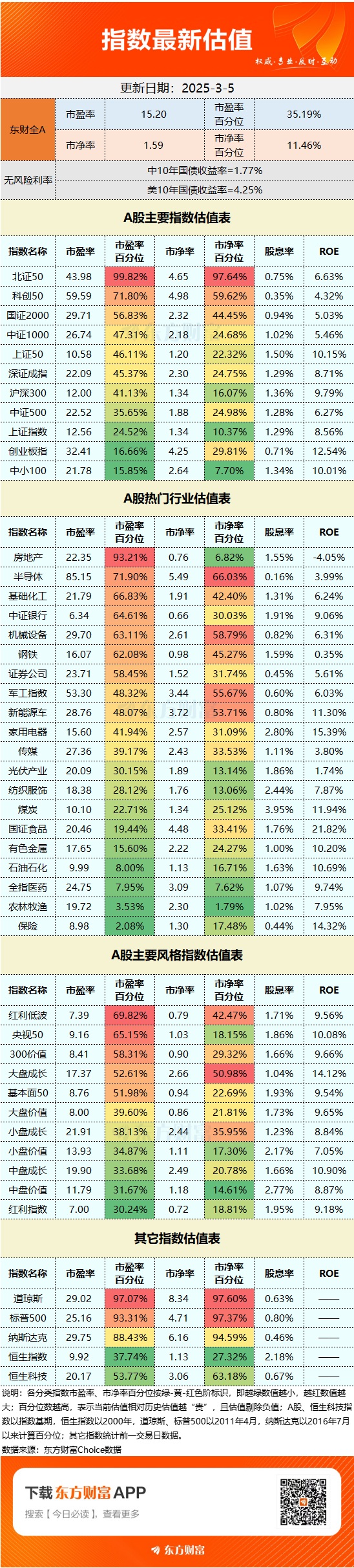 截至3月5日收盘,东方财富Choice数据显示,东财全A市盈率为15.2倍,市盈率百分位为35.19%;市净率为1.59倍,市净率百分位11.46%。