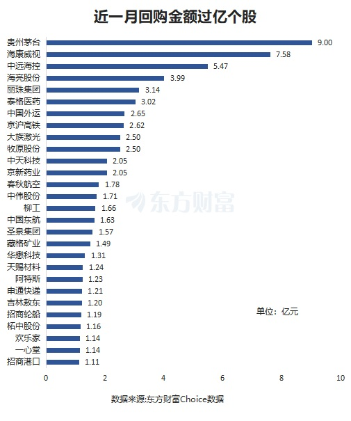 具体看个股,贵州茅台为近一月回购金额最多个股,金额为9亿元。海康威视紧随其后,回购金额为7.58亿元。中远海控排在第三位,回购金额5.47亿元。