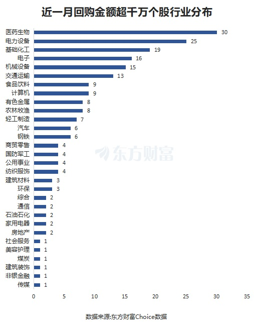 从行业分布来看,近一月回购金额超千万的209股,分布于医药生物最多,为30股。电力设备紧随其后,为25股。基础化工为19股。电子、机械设备、交通运输等也分布靠前。