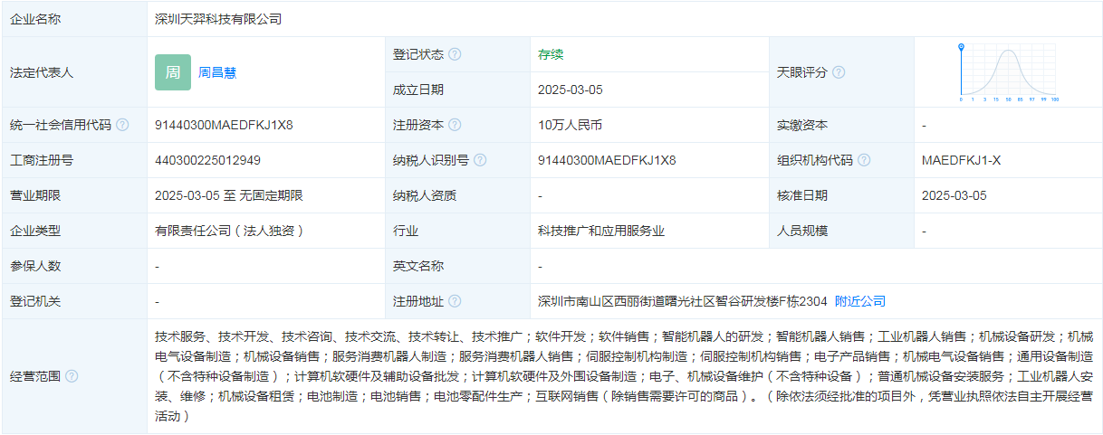 3月5日,天眼查数据显示,深圳天羿科技有限公司成立,注册资本10万元,法定代表人周昌慧,由杭州宇树科技有限公司(简称:宇树科技)全资持股。该公司主要经营范围包括:智能机器人研发与销售、工业机器人销售、服务消费机器人制造与销售等。