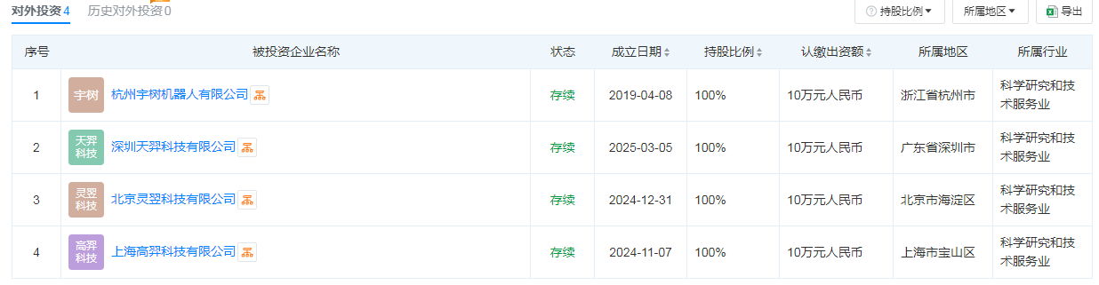 天眼查数据显示,除深圳天羿科技有限公司外,宇树科技还对外投资3家公司,包括杭州宇树机器人有限公司、北京灵翌科技有限公司、上海高羿科技有限公司。