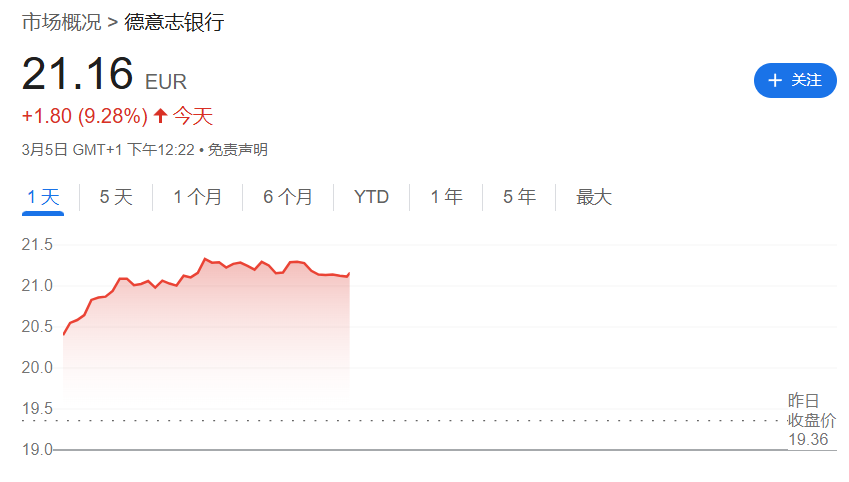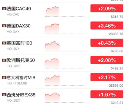 3月5日晚间,欧洲股市集体大涨,德国股市领涨,现涨超3%,法国股市涨超2%,欧洲斯托克50指数以及意大利股市均涨超2%。