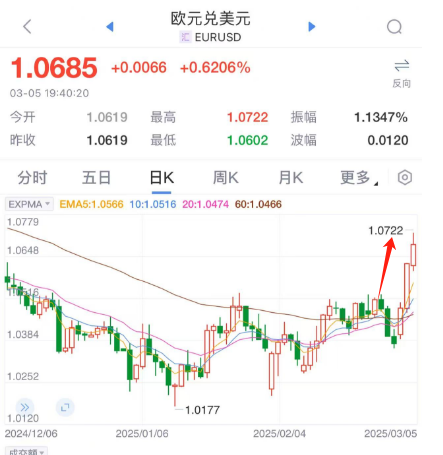 欧元飙升至1.0684美元,为2024年11月13日以来的最高水平,并有望实现自2022年底以来的最大单日涨幅,投资者押注德国和其他国家的增加支出将提振欧洲经济。