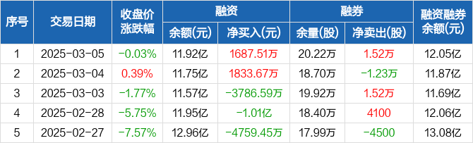 融资方面,当日融资买入1.02亿元,融资偿还8505.79万元,融资净买入1687.51万元。融券方面,融券卖出1.62万股,融券偿还1000股,融券余量20.22万股,融券余额1258.71万元。融资融券余额合计12.05亿元。