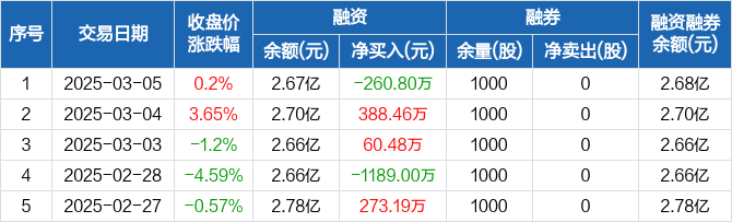 融资方面,当日融资买入1359.45万元,融资偿还1620.25万元,融资净偿还260.8万元。融券方面,融券卖出0股,融券偿还0股,融券余量1000股,融券余额5120元。融资融券余额合计2.68亿元。