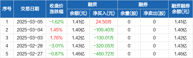 融资方面,当日融资买入522.58万元,融资偿还498.08万元,融资净买入24.5万元。融券方面,融券卖出0股,融券偿还0股,融券余量0股,融券余额0元。融资融券余额合计1.41亿元。