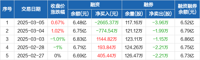 融资方面,当日融资买入2372.5万元,融资偿还5037.87万元,融资净偿还2665.37万元。融券方面,融券卖出3.46万股,融券偿还7.42万股,融券余量117.16万股,融券余额351.48万元。融资融券余额合计6.52亿元。