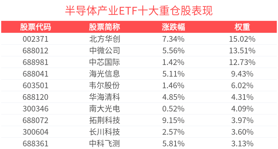 数据显示,截至2025年2月28日,中证半导体产业指数(931865)前十大权重股分别为北方华创(002371)、中微公司(688012)、中芯国际(688981)、海光信息(688041)、韦尔股份(603501)、拓荆科技(688072)、华海清科(688120)、南大光电(300346)、长川科技(300604)、中科飞测(688361),前十大权重股合计占比76.69%。