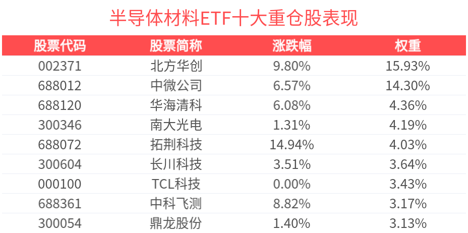 数据显示,截至2025年2月28日,中证半导体材料设备主题指数(931743)前十大权重股分别为北方华创(002371)、中微公司(688012)、沪硅产业(688126)、拓荆科技(688072)、华海清科(688120)、南大光电(300346)、长川科技(300604)、中科飞测(688361)、鼎龙股份(300054)、雅克科技(002409),前十大权重股合计占比62.4%。