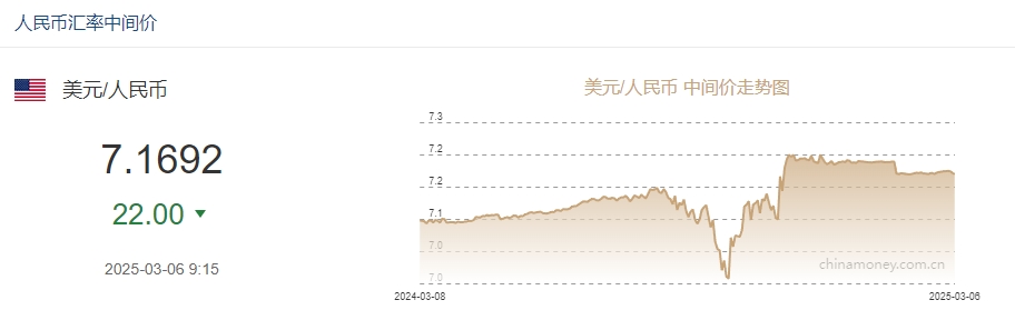 3月6日人民币对美元中间价报7.1692元 上调22个基点