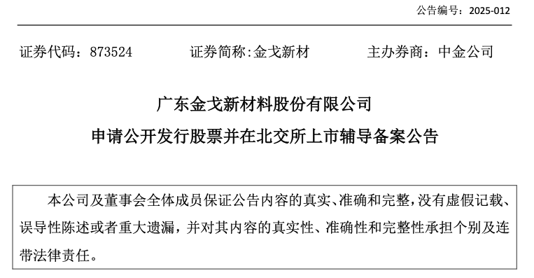 据证监会网站公开发行辅导公示信息显示,广东金戈新材料股份有限公司(以下简称“金戈新材”)于2025年2月28日向广东证监局提交了北交所上市的辅导备案材料,辅导机构为中金公司。这意味着公司正式启动北交所IPO。