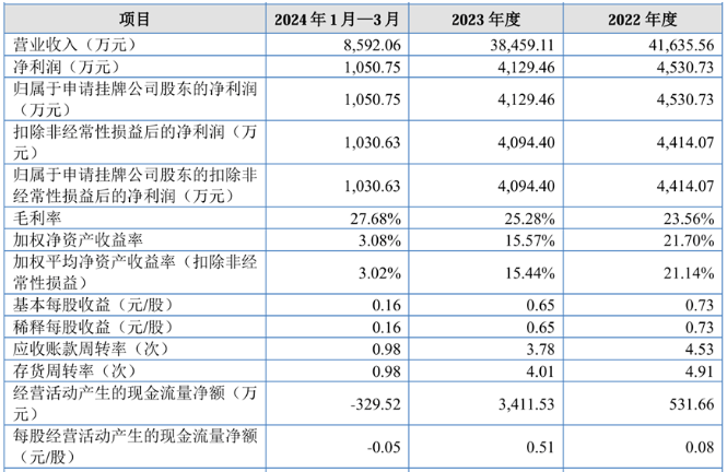具体来看,2022年度、2023年度及2024年1月-3月(以下称报告期),金戈新材营业收入分别为4.16亿元、3.85亿元、8592.06万元;净利润分别为4530.73万元、4129.46万元、1050.75万元;扣非净利润分别为4414.07万元、4094.40万元、1030.63万元。