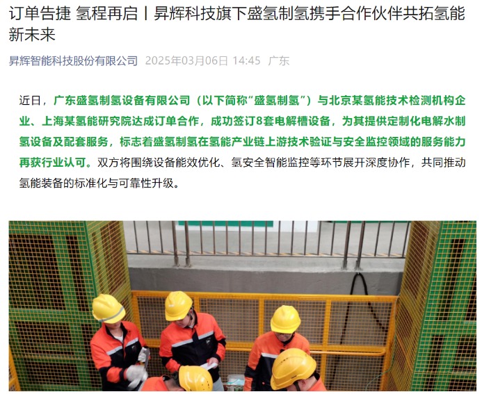昇辉科技:旗下盛氢制氢签订8套电解槽设备