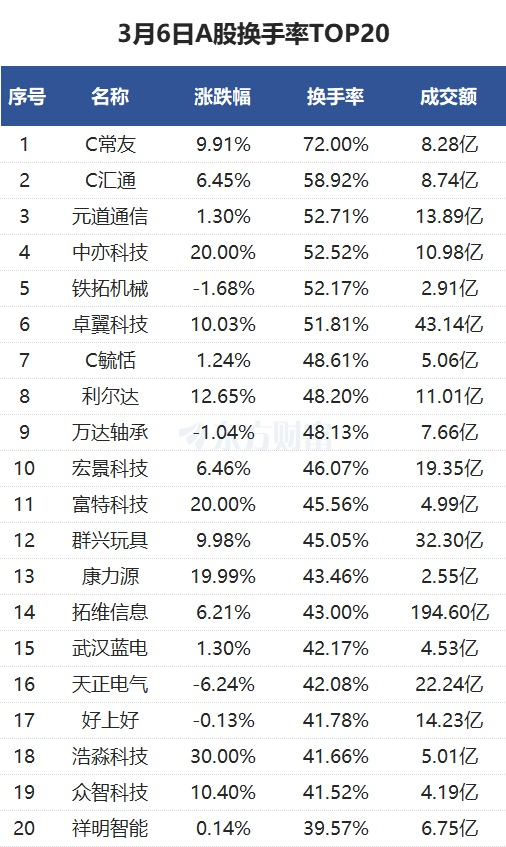 当天换手率最高的个股为C常友,全天换手率72%。C汇通紧随其后,全天换手率58.92%。