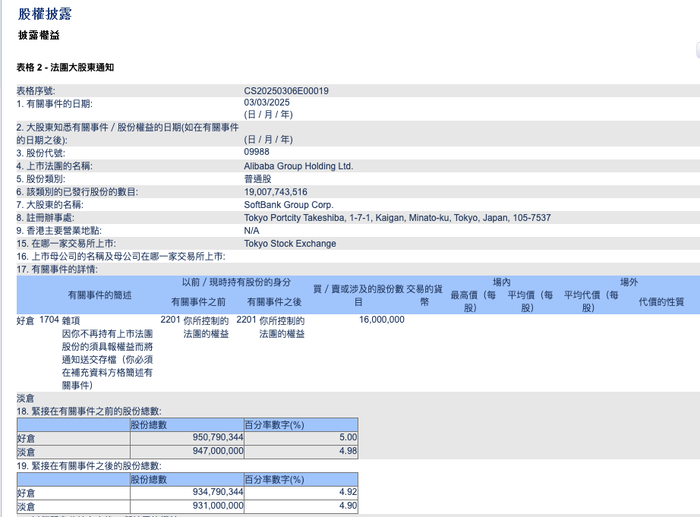 3月6日,据港交所权益披露,软银集团在阿里巴巴-W的持股比例于3月3日从5.00%降至4.92%。