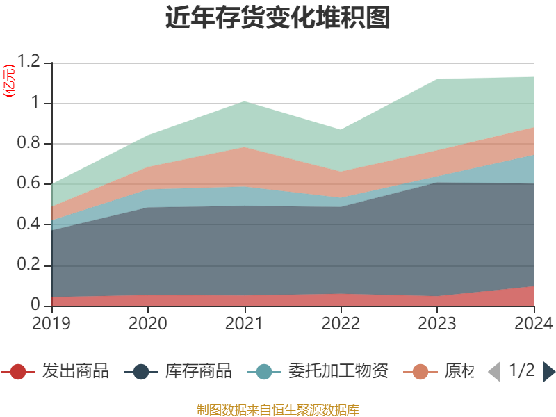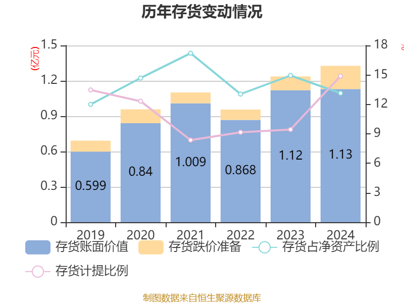 从存货变动来看,截至2024年末,公司存货账面价值为1.13亿元,占净资产的13.14%,较上年末增加100.08万元。其中,存货跌价准备为1974.76万元,计提比例为14.88%。