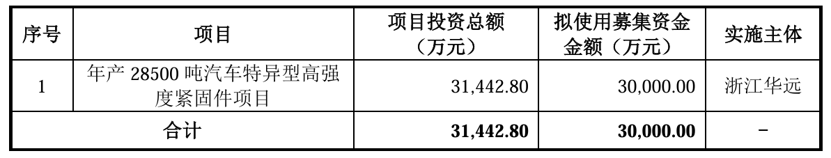 浙江华远(301535)3月6日披露招股意向书,计划公开发行6379.41万股,占发行后总股本的15.00%,拟募集资金3亿元用于年产28500吨汽车特异型高强度紧固件项目。本次发行的申购日期3月14日。