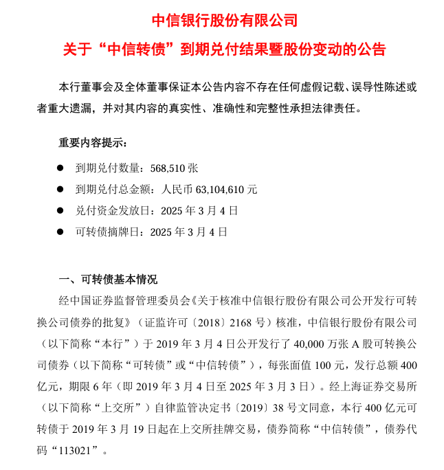 2025年1月1日至3月3日,共有69.8亿元的“中信转债”转换为本行A股普通股,转股股数为12.5亿股。