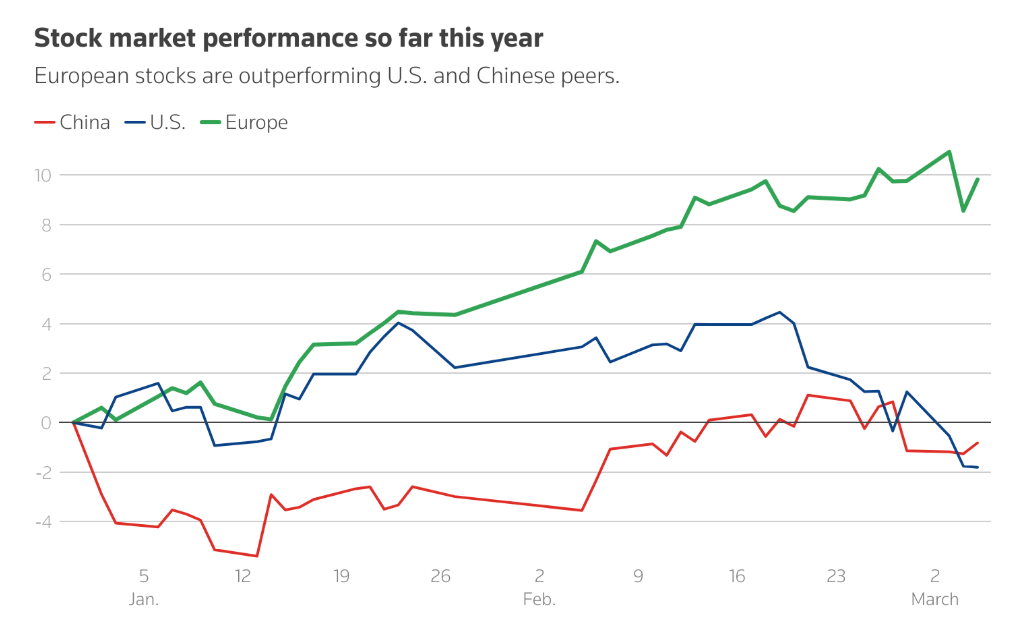 与此同时,华尔街传来大消息:美国市场正发生重大转变。理柏的数据显示,自去年11月特朗普赢得大选以来,中国主题基金的资金几乎不间断地流出,但这种现象在2月初出现逆转,自此以后流入了约 30亿美元。一场历史性的全球贸易战、欧洲拟出台的1.2万亿美元财政刺激计划以及中国崛起成为科技竞赛领头羊,正在颠覆全球资金的认知,一些活跃资本可能正在撤出美国,转战中欧。