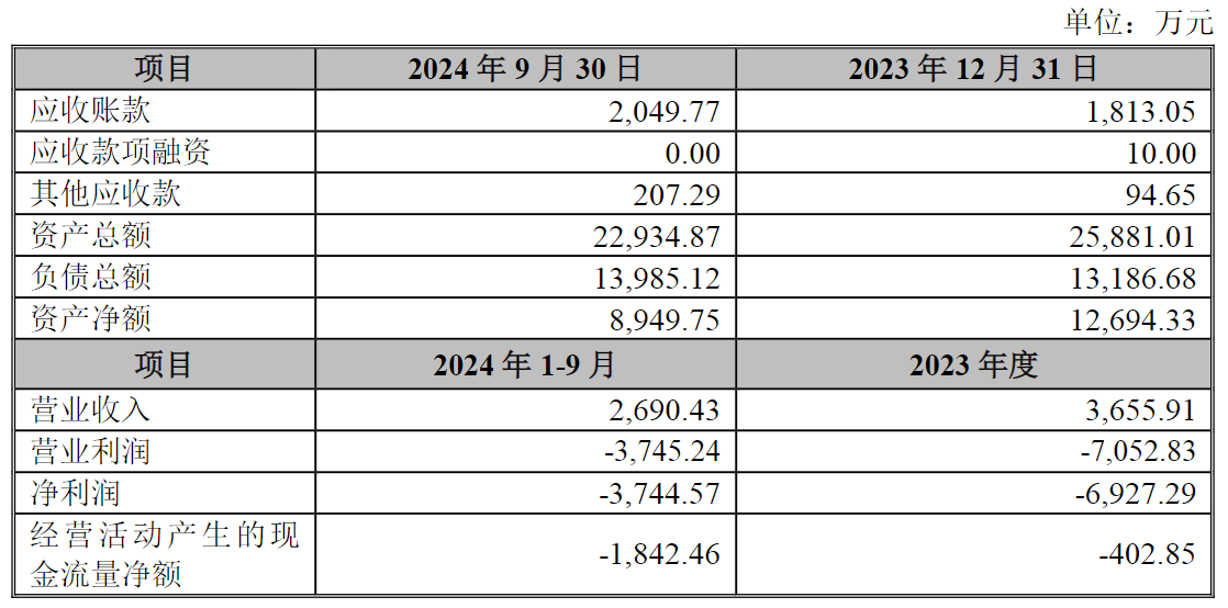 财务情况来看,截至2024年9月30日,埃科思资产总额为2.29亿元。2024年前三季度,埃科思实现营收2690.43万元,净亏损3744.57万元。
