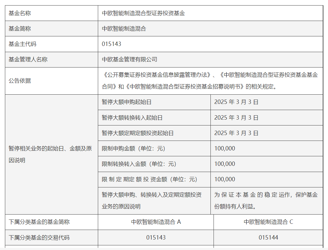 3月3日起,中欧基金旗下中欧智能制造混合基金在全渠道实施限购,单日单账户申购上限为10万元。中欧基金表示,此举旨在“保护基金份额持有人利益,优化投资者持有体验”,成为近期科技主题基金限购潮的又一典型案例。