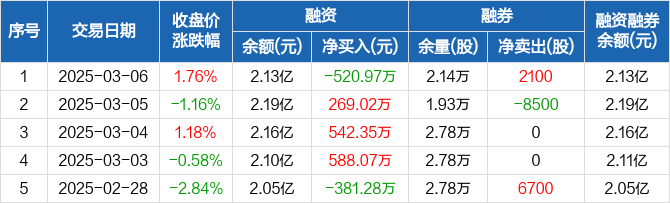融资方面,当日融资买入1119.21万元,融资偿还1640.17万元,融资净偿还520.97万元。融券方面,融券卖出2100股,融券偿还0股,融券余量2.14万股,融券余额7.4万元。融资融券余额合计2.13亿元。