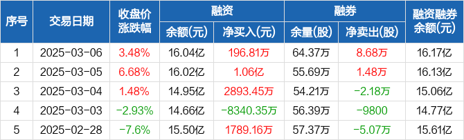 融资方面,当日融资买入4.96亿元,融资偿还4.94亿元,融资净买入196.81万元,连续3日净买入累计1.37亿元。融券方面,融券卖出14.95万股,融券偿还6.27万股,融券余量64.37万股,融券余额1360.78万元。融资融券余额合计16.17亿元。