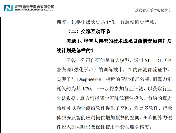 新开普:星普大模型内部测评智能推理效果与DeepSeek-R1相近 算力消耗约其1/20