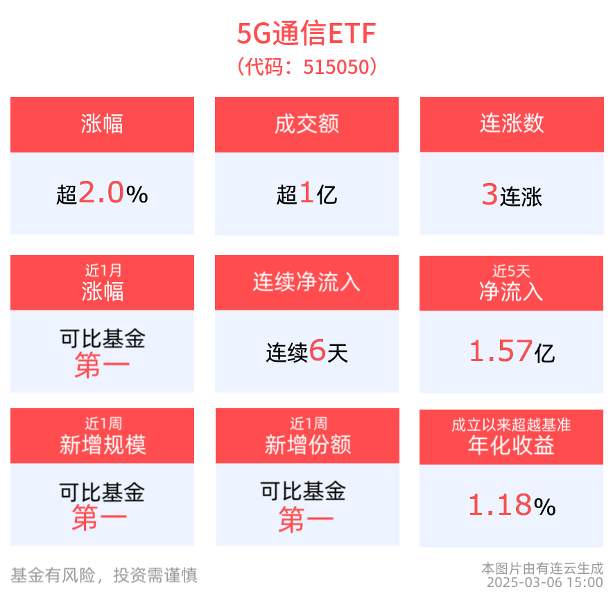 相关ETF获得资金关注,拉长时间看,截至2025年3月6日,5G通信ETF近1月累计上涨1.79%,近1周规模增长2.13亿元,近6天获得连续资金净流入,最高单日获得8080.10万元净流入,合计“吸金”1.69亿元。