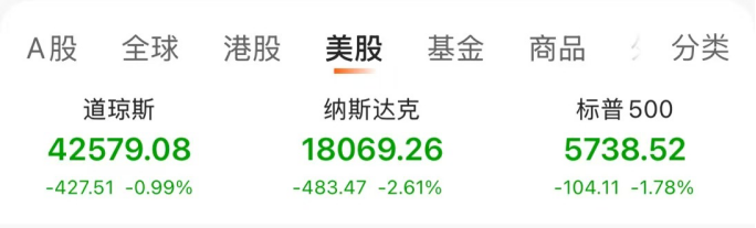 美东时间3月6日,美股三大指数全线下挫。截至收盘,道指跌0.99%,收于42579.08点;标普500指数跌1.78%,报5738.52点;纳指跌2.61%,收于18069.26点,正式进入技术性调整区间,即从最近的高点下跌超过10%。
